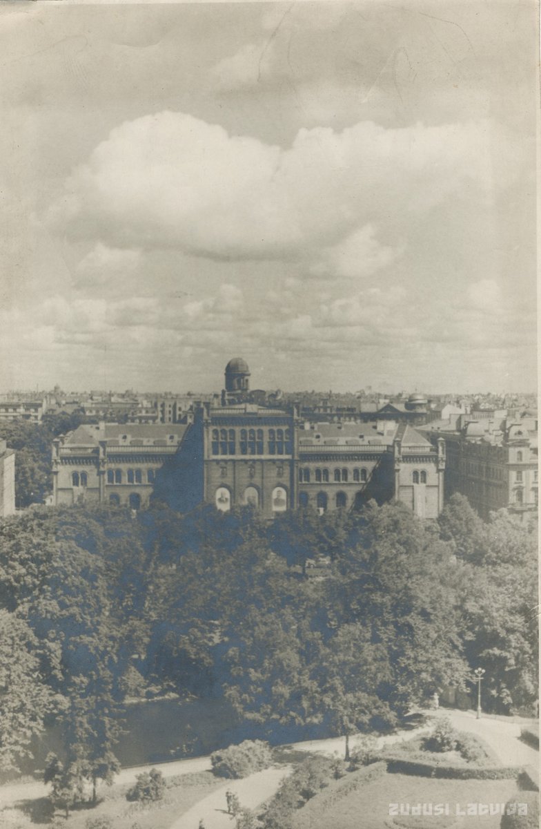 Latvijas Universitāte 1940., 1950. gados. Universitātes fasādē izvietoti K. Marksa un J.Staļina portreti