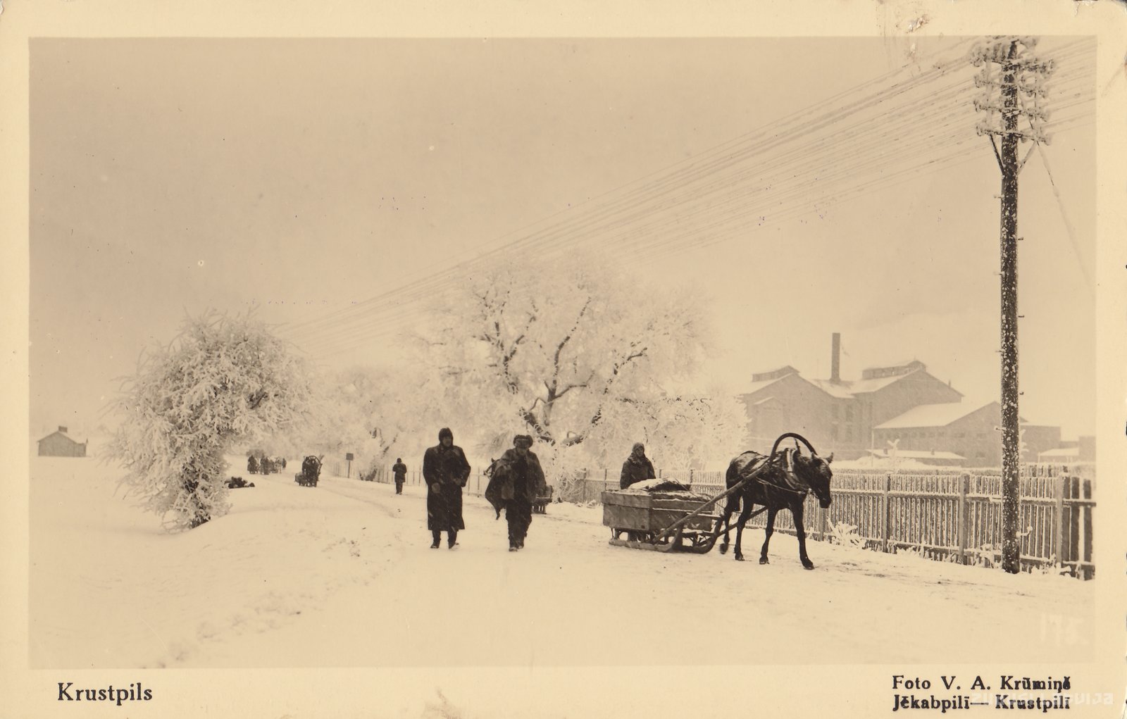 Frontālajā pusē uzraksti: Krustpils, Foto V.A.Krūmiņš Jēkabpilī-Krustpilī. Otrajā pusē V.Eichenbauma arhīva zīmogs un Preses un Biedrību departamenta zīmogs