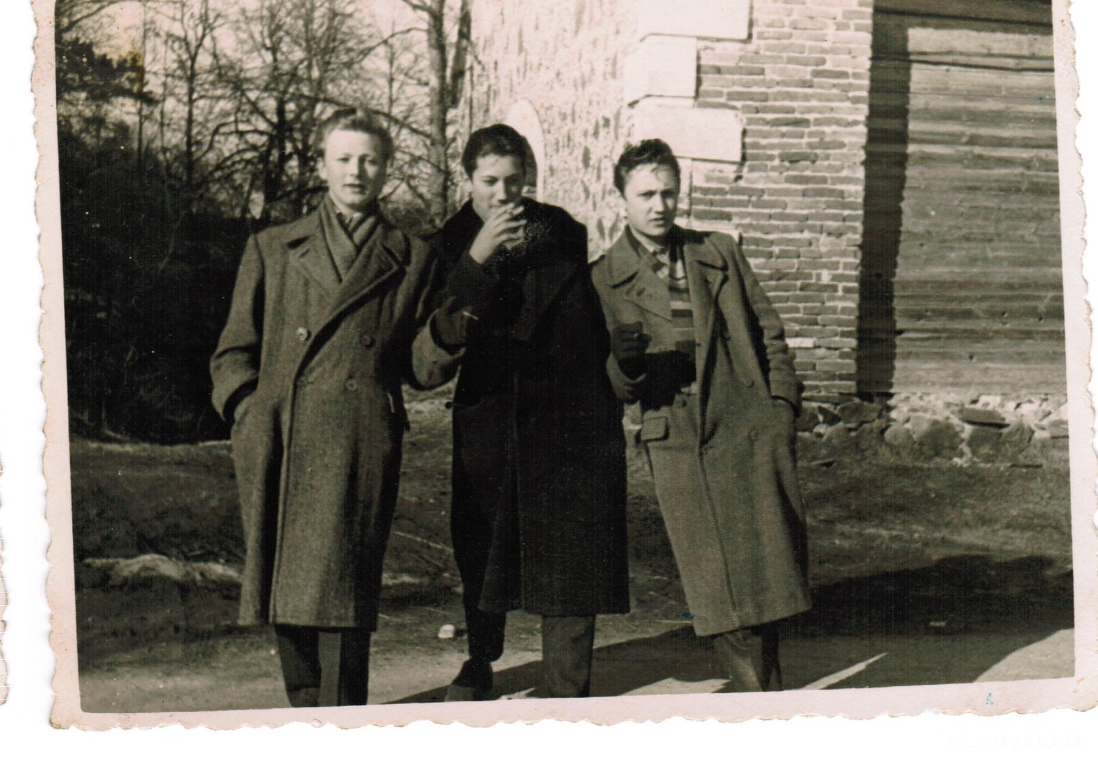 Brālēni Indulis Šulcs (pa kreisi) un Viesturs Bērziņš (pa labi) ar draugu Uldis Peci (melnajā mētelī) pie Raiskumkroga Cēsīs 1957. gada pavasarī
