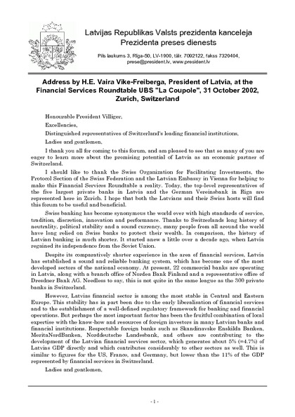 Address by H.E. Vaira Vike-Freiberga, President of Latvia, at the Financial Services Roundtable UBS "La Coupole", 31 October 2002, Zurich, Switzerland
