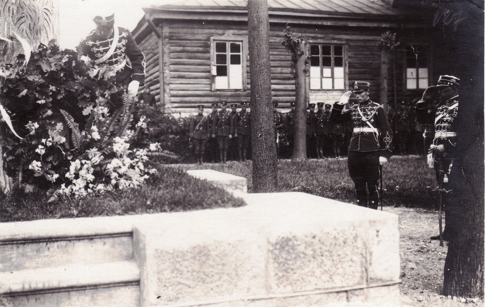 Jātnieku pulka kritušo karavīru piemineklis Jātnieku dārziņa pie kazarmām [tagad Andreja Pumpura skvērs], Jaunā pilsēta Daugavpilī. Igauņu virsnieku delegācijā pulka X gadu jubileja 1928. gada 5.jūlijā. Atklāts 1923.gada 23.jūnijā. Autors kara ierēdnis J. Lapkašs