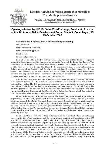 Opening address by H.E. Dr. Vaira Vike-Freiberga, President of Latvia, at the 4th Annual Baltic Development Forum Summit, Copenhagen, 13 15 October 2002