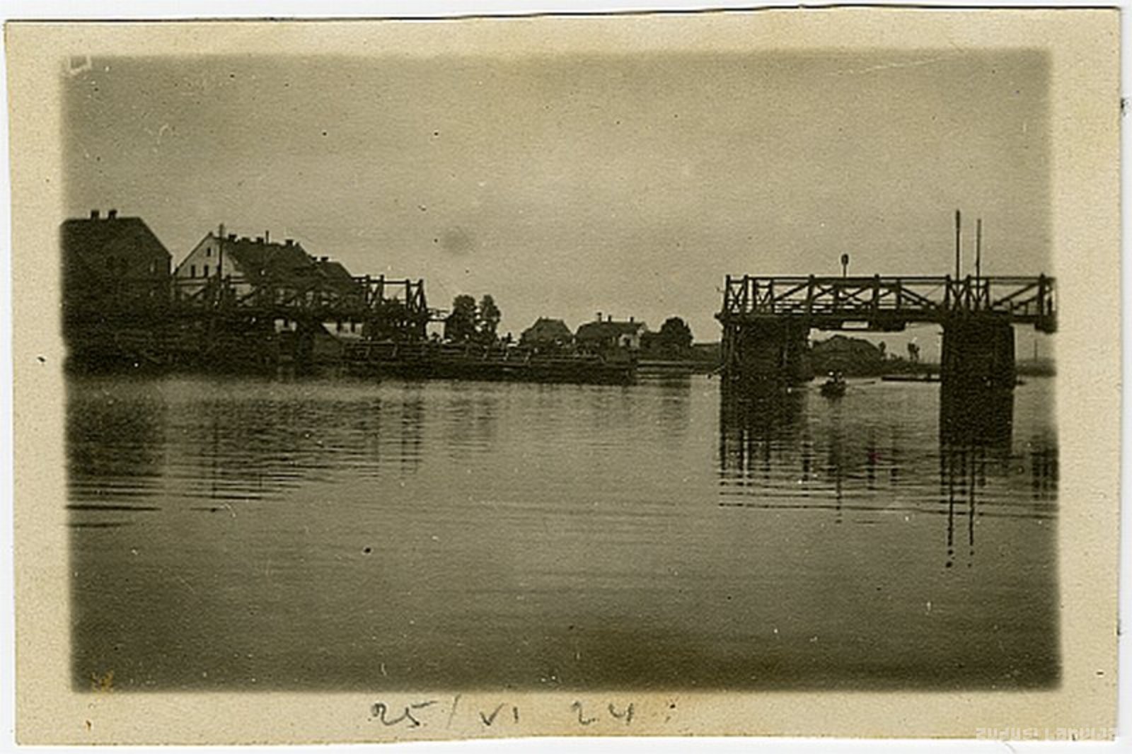 Lielupes tilta būvniecība Jelgavā. 1923. gada pavasarī Jelgavā bija lieli plūdi, kas sabojāja Lielupes tiltu. Pilsētas galva Pēteris Godmanis 1924. gadā lūdza Satiksmes ministrijai piešķirt finanses Lielupes tilta atjaunošanai. 1925. gadā naudu celtniecībai piešķīra un 1926. gada 14. aprīlī tilts tika atklāts lietošanai. Attēls datēts ar 1924.gada 25. jūniju un tajā varētu būt iemūžināts vecajam tiltam nodarītais palu laika bojājums