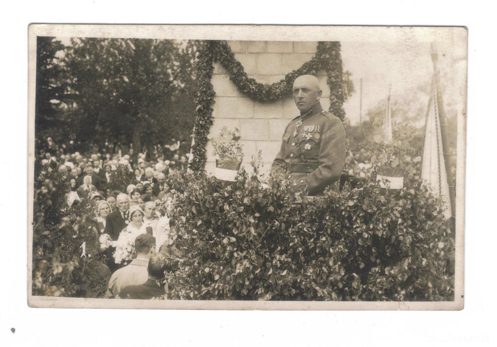 Latvijas armijas pulkvedis (vēl. ģenerālis), 1.Liepājas kājnieku pulka komandieris Jānis Ezeriņš pie pieminekļa Atbrīvošanas cīņās kritušajiem karavīriem Liepājā, Ziemeļu kapos. Piemineklis celts pēc arhitekta K. Bikšes projekta, atklāts 1924. gada 18. novembrī. Piemineklis sabojāts pēc Otrā pasaules kara, atjaunots 1989.gadā