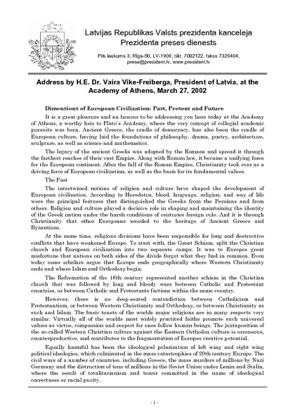 Address by H.E. Dr. Vaira Vike-Freiberga, President of Latvia, at the Academy of Athens, March 27, 2002