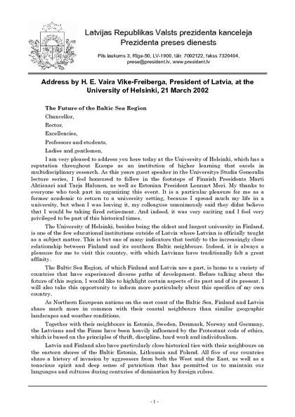 Address by H. E. Vaira Vike-Freiberga, President of Latvia, at the University of Helsinki, 21 March 2002