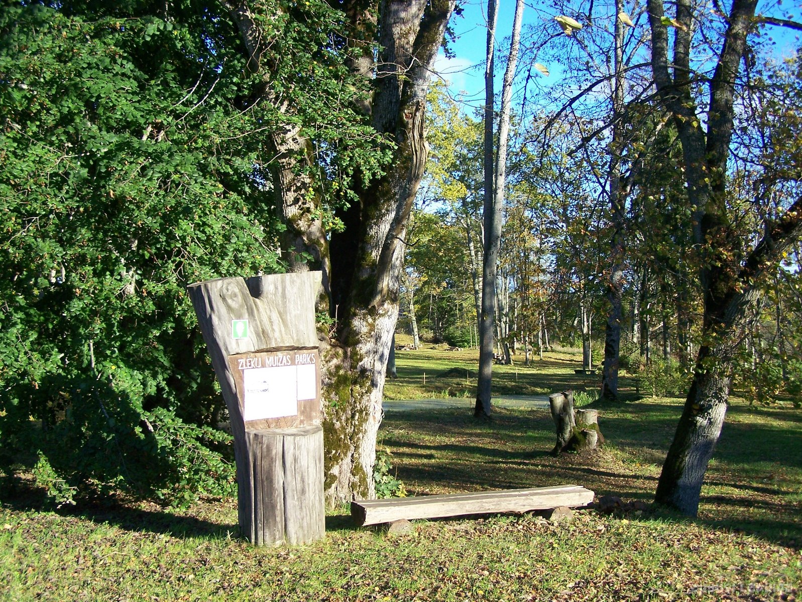 Ieeja Zlēku muižas parkā. Vides objektus veidojis zlēcinieks Valters Veidemanis