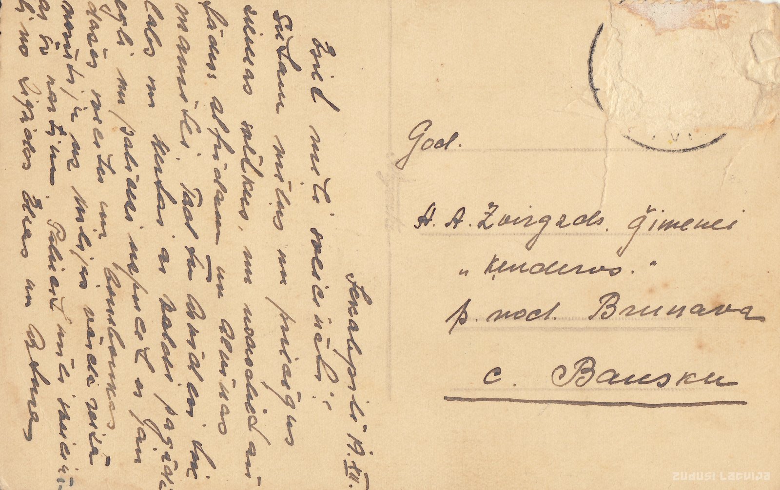 Fotodarbnīcas spiedogs: "V.A.Krūmiņš Jēkabpilī-Krustpilī". Otrajā pusē vēstule