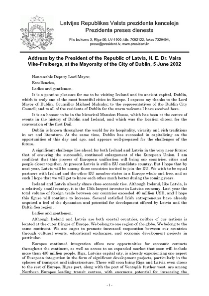 Address by the President of the Republic of Latvia, H. E. Dr. Vaira Vike-Freiberga, at the Mayoralty of the City of Dublin, 5 June 2002