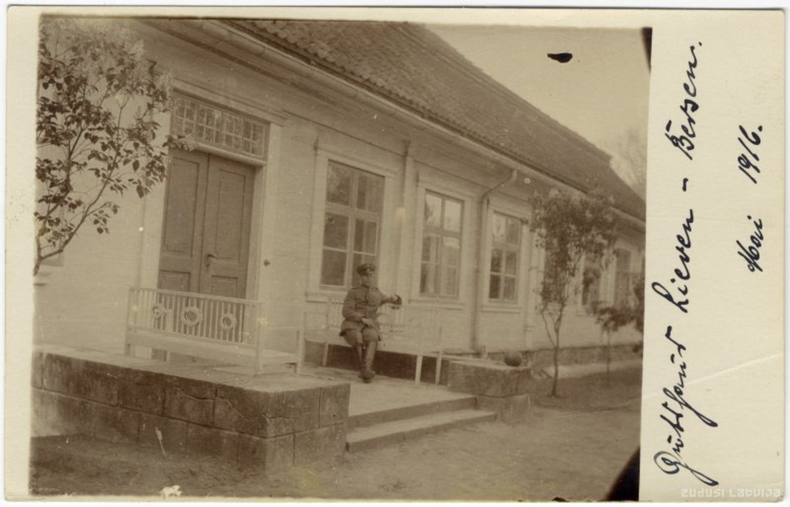 Līvbērze. Vācu karavīrs uz Līvbērzes muižas lieveņa