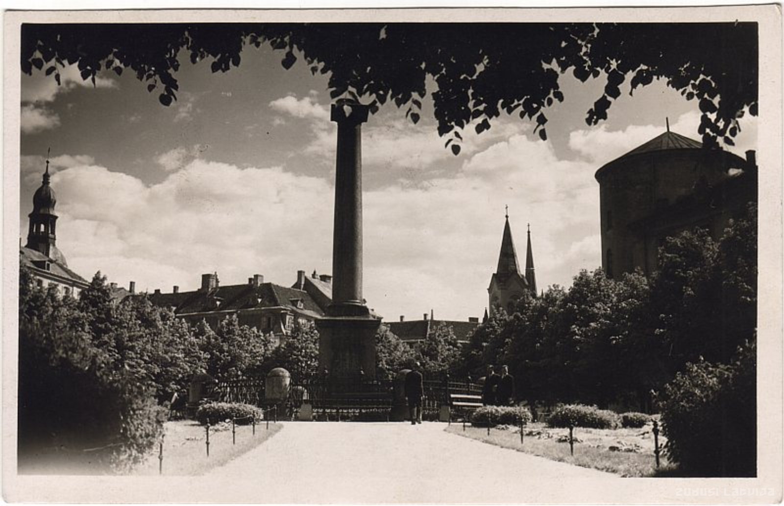 Pils laukuma vidusdaļā, atzīmējot Krievijas uzvaru karā pret Napoleona vadīto Francijas armiju, 1814. gadā tika likts pamatakmens pirmajam monumentālajam piemineklim Rīgā - Uzvaras kolonnai, ko latvieši tolaik sauca par Uzvaras stabu. Pieminekli veidoja 7,15 metrus augsta monolīta Somijas granīta kolonna 1,15 metrus diametrā. To vainagoja uz kapiteļa novietota, uzlodes stāvoša spārnota Uzvaras dievietes skulptūra ar palmu un uzvaras lauru slavas vainagu rokā. Kolonnas postamentu, ko norobežoja astoņi akmens stabi un kalts metāla žogs, rotāja bronzas ērgļi ar ziedu vītnēm, plātnes ar uzrakstu latīņu un krievu valodā, Krievijas ērglis un Rīgas pilsētas ģērbonis. Projekta autors, iespējams, bijis Džakomo Kvarengi, skulptūru pēc S.Pimenova modeļa bronzā atlējis V.Jekimovs. Pieminekļa augstums bija 14,8 metri. Pieminekli uzstādīja 1817. gadā. 1915. gadā statuja un uzrakstu plātnes tika evakuētas uz Krieviju. Kolonnas granīta daļas pie pils atradās līdz 1938. gadam