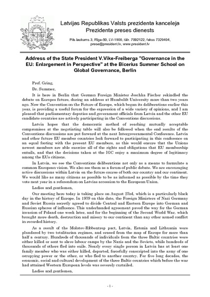 Address of the State President V.Vike-Freiberga "Governance in the EU: Enlargement in Perspective" at the Bicerius Summer School on Global Governance, Berlin