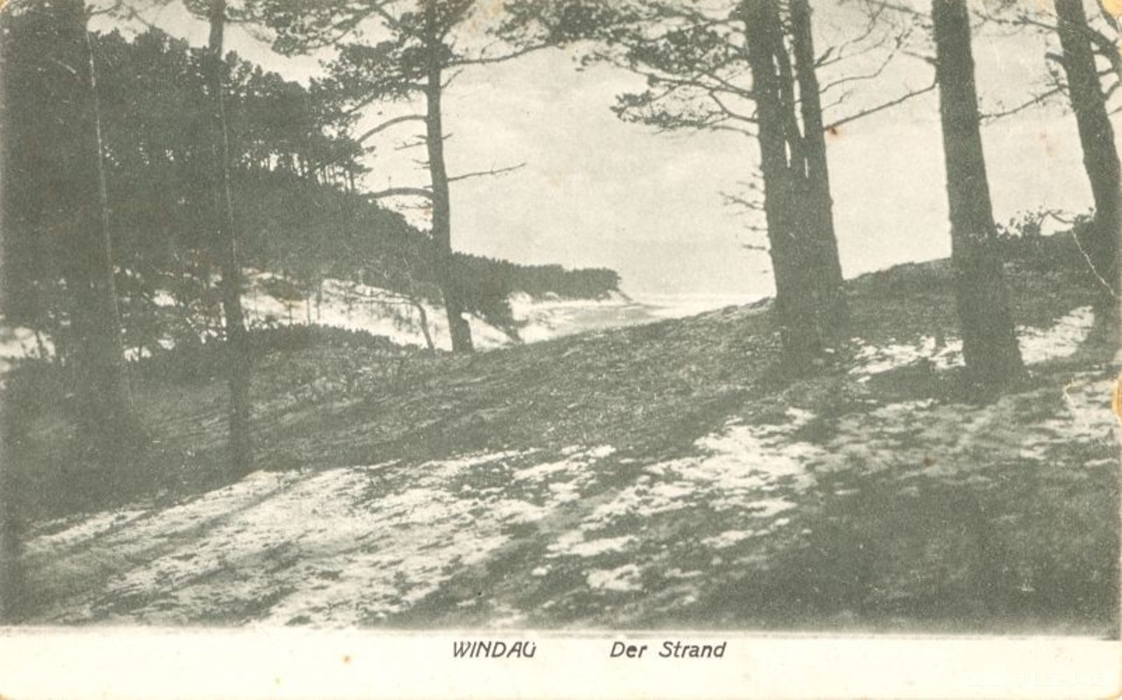Ventspils jūras krasts 20.gadsimta sākumā. Jūras krasts ir smilšains. Gar malu lielas kāpas, kas apaugušas ar priežu mežu