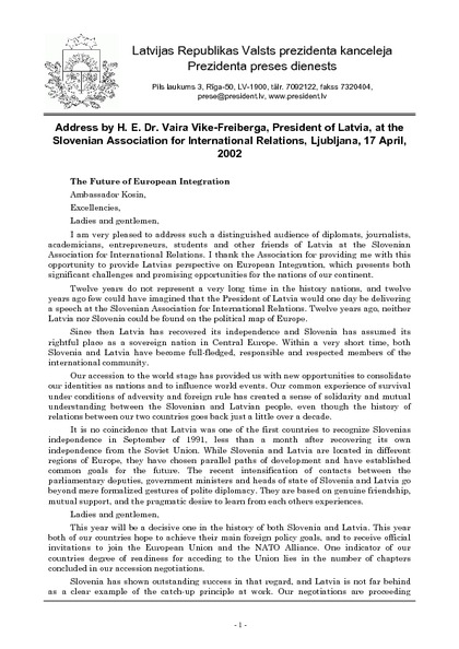 Address by H. E. Dr. Vaira Vike-Freiberga, President of Latvia, at the Slovenian Association for International Relations, Ljubljana, 17 April, 2002
