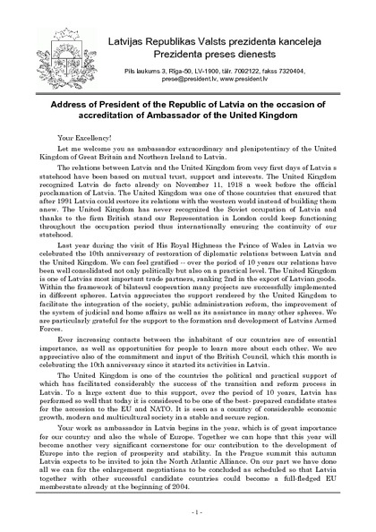 Address of President of the Republic of Latvia on the occasion of accreditation of Ambassador of the United Kingdom