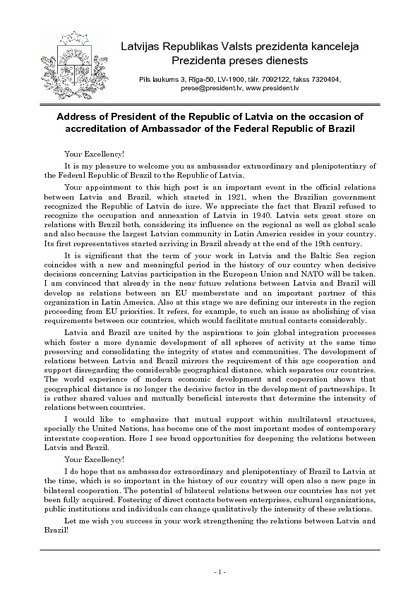 Address of President of the Republic of Latvia on the occasion of accreditation of Ambassador of the Federal Republic of Brazil