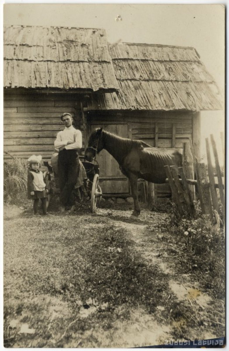 Ludza. Vīrietis ar bērnu pie zirgu staļļa
