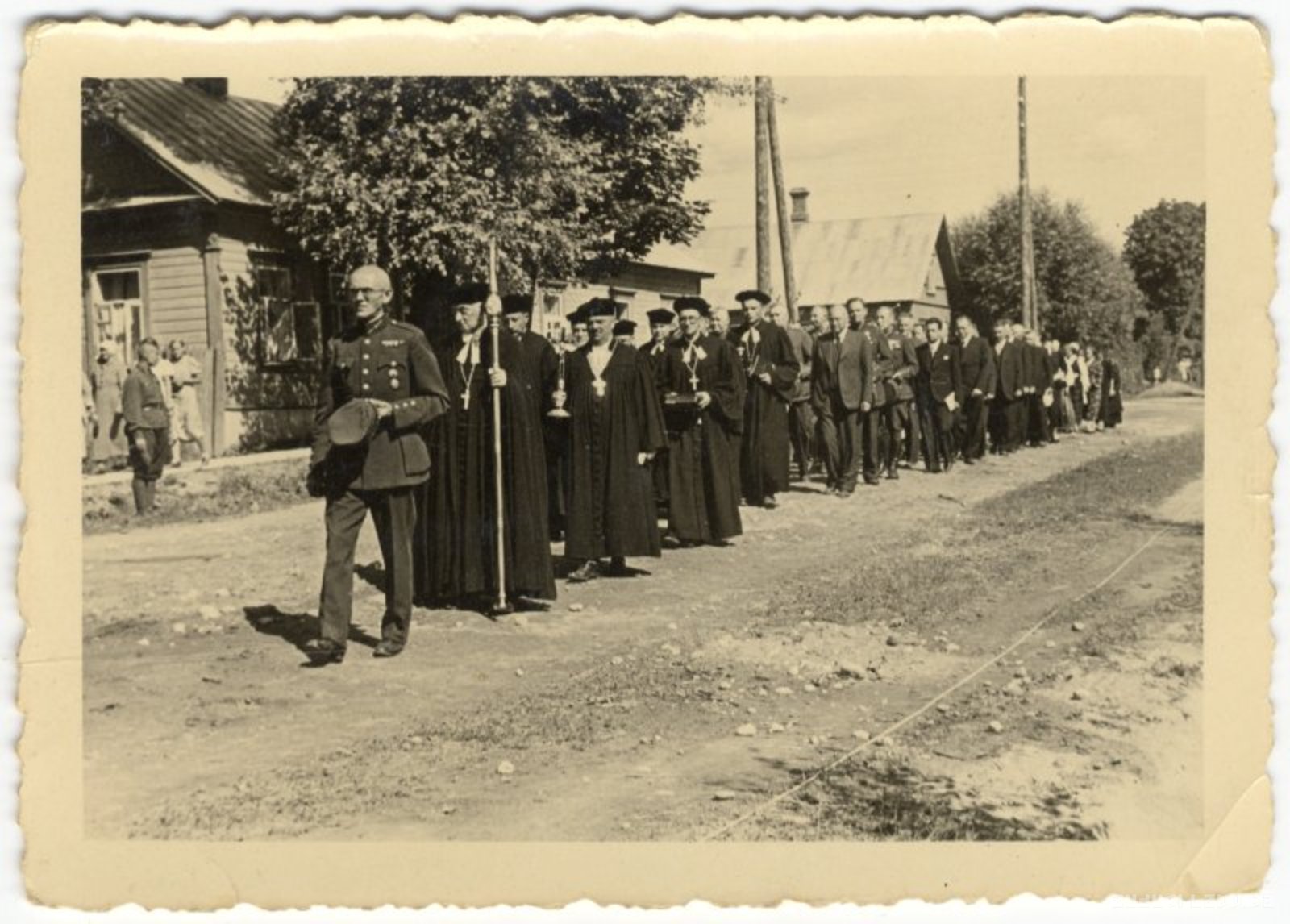 Rēzeknes Svētās Vienības (mūsdienās Svētās Trīsvienības) evanģeliski luteriskās draudzes jaunuzceltās baznīcas iesvētīšanas gājiens no Rēzeknes Valsts arodvidusskolas, kur notika dievkalpojumi, citi draudzes pasākumi dievnama būvniecības laikā. Gājiena priekšgalā baznīcas draudzes priekšnieks pulkvežleitinants Mārtiņš Priedulāns, seko LELB arhibīskaps Teodors Grīnbergs, mācītāji, draudzes padomes locekļi, iespējams koristi. Ielas malās kārtības sardzē novietojušies Rēzeknes 9. kājnieku pulka obligātā militārā dienesta kareivji