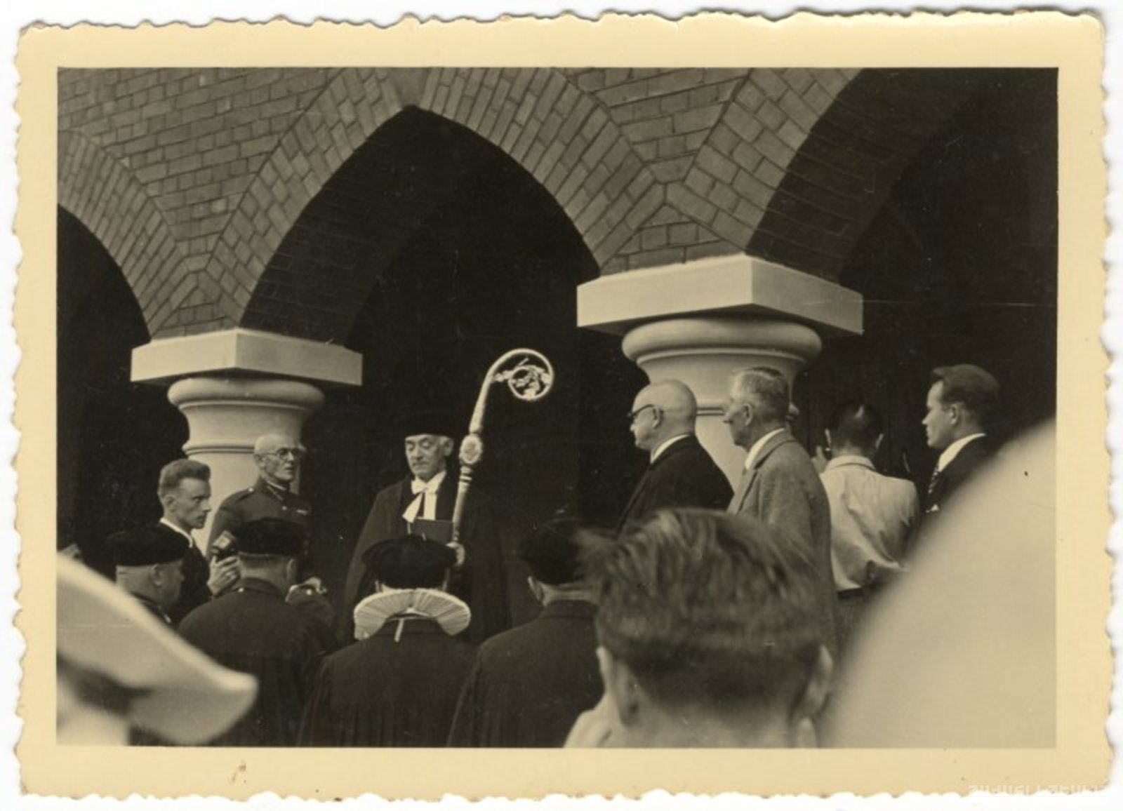 Brīdis pirms ieiešanas dievnamā, kad draudzes baznīcas priekšnieks pulkvežleitinants M. Priedulāns draudzes vārdā nodod arhibīskapam jaunuzcelto dievnamu ar lūgumu veikt tā iesvētīšanu, pa labi no arhibīskapa būvprojekta autors un darbu vadītājs, būvinženieris Jānis Cīrulis, viņam rokās uz samta spilventiņa vairāk kā 2 kg smago baznīcas ārduvju atslēga. Pa kreisi no M. Priedulāna, ar mikrofonu rokās iespējams kāds Latvijas radiofona darbinieks