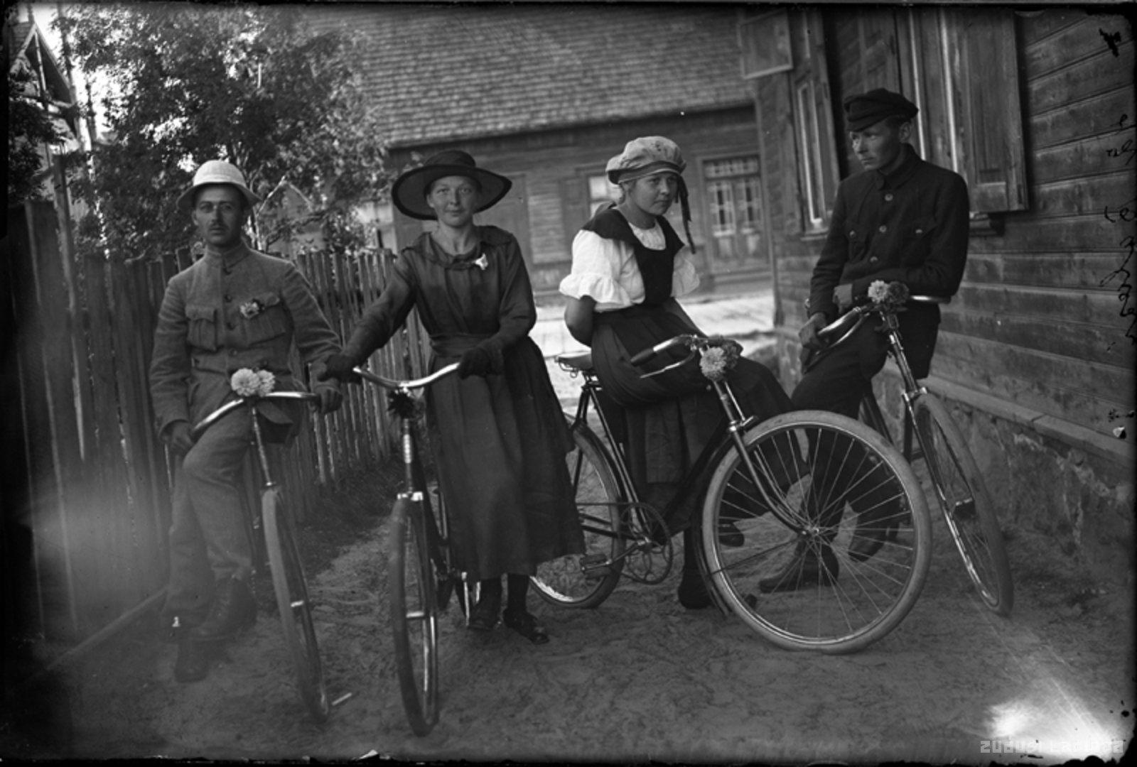 Divas sievietes un divi vīrieši ar velosipēdiem