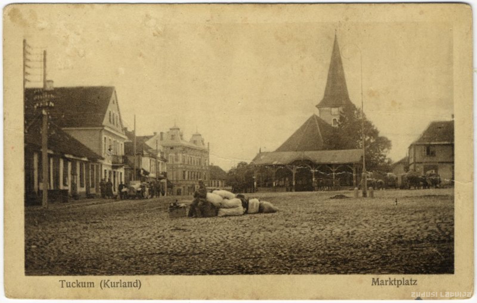 Atklātnē pa labi redzams bijušais Tukuma Viesīgās biedrības nams, kas atklāts 1902. gadā. Tolaik tas bijis viens no greznākajiem un modernākajiem namiem pilsētā. Viesīgās biedrības nosaukumu nams ieguva, jo tās cēlāju – Tukuma latviešu biedrības statūtus Krievijas cara valdība apstiprināja tikai ar noteikumu, ka tās nosaukumā nedrīkst būt vārds "latviešu". Tagad ēkā atrodas pilsētas Kultūras nams