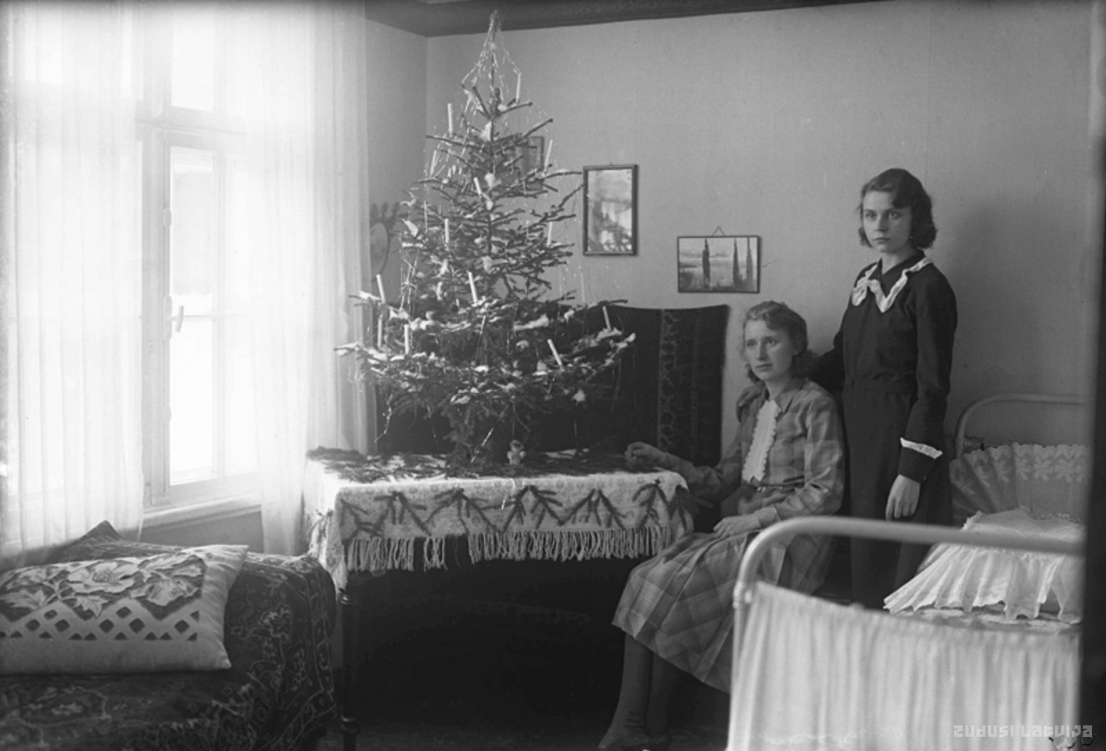 Divas jaunas sievietes pie Ziemassvētku eglītes