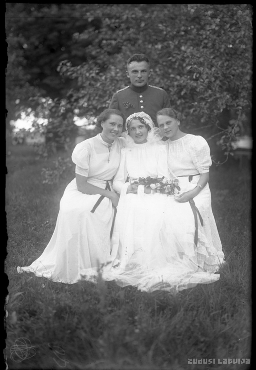 Kāzas. Jaunais pāris ar līgavas māsām