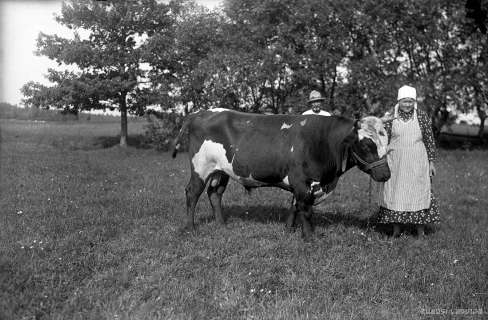 Sieviete un vīrietis ganībās ar raibu govi