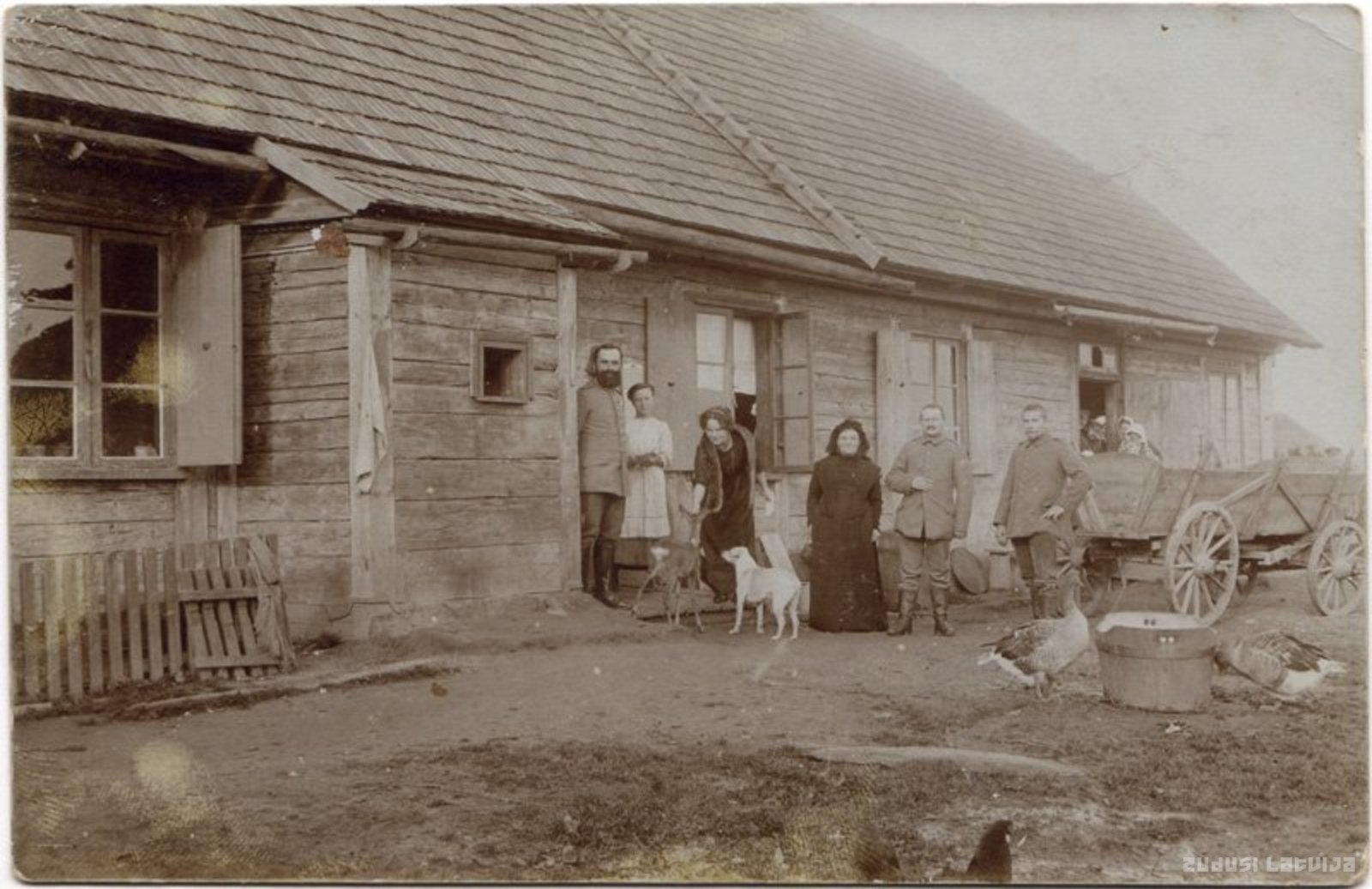 Kalētu pagastā Pirmā pasaules kara laikā. Vācu armijas virsnieki un civiliedzīvotāji pie kādas dzīvojamās ēkas