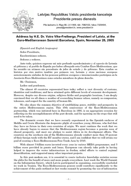 Address by H.E. Dr. Vaira Vike-Freiberga, President of Latvia, at the Euro-Mediterranean Summit Barcelona, Spain, November 28, 2005
