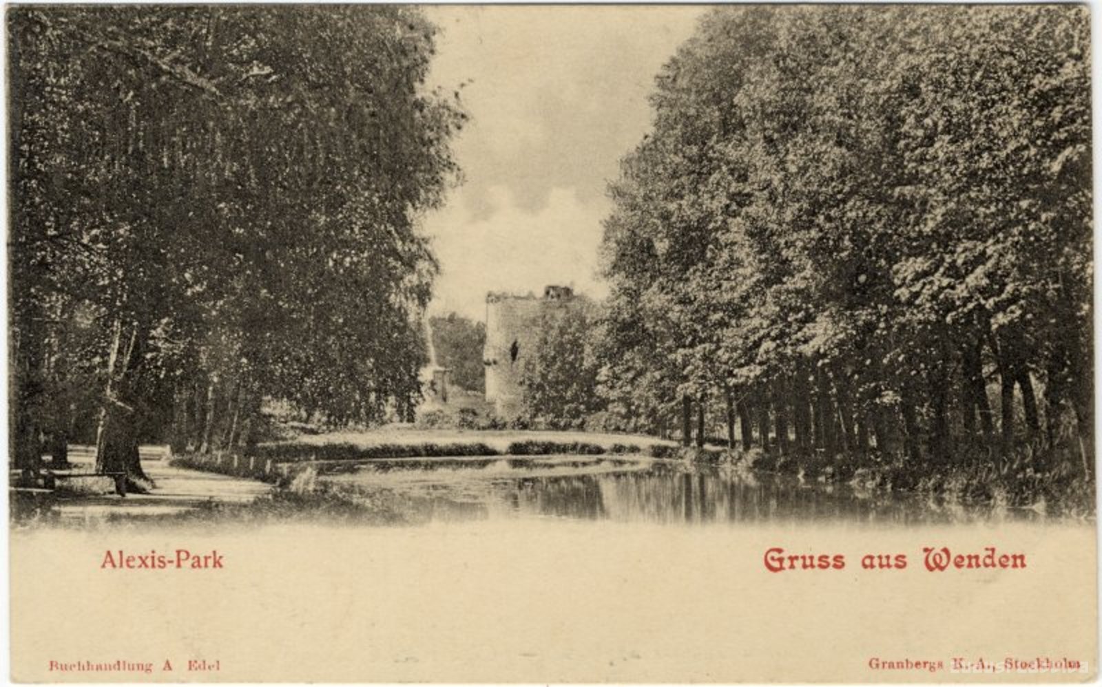 Parku 19. gadsimtā atpūtnieku vajadzībām iekārtoja grāfs K. Zīvers viņa izveidotās kūriestādes tuvumā. Tā kā 19. gadsimta parku arhitektūrā modē bija nākušas romantiskas pilsdrupas, tad šeit tās tika uzbūvētas mākslīgi. Parka vecākais nosaukums ir Alekša parks. Ir ziņas, ka augsto liepu rindu stādījis E. Veidenbauma vectēvs Kaspars Veidenbaums, kurš tajā laikā bija Cēsu pilsmuižas dārznieks. Alekša vārdu parks ieguvis 1904. gadā pēc Krievijas troņmantnieka Alekseja (Nikolaja II dēla) piedzimšanas. Pēc 1934. gada 15. maija apvērsuma parks pārdēvēts par 15. Maija parku. Pēc Otrā pasaules kara parku nosauca par 1. Maija parku, bet 20. gadsimta 70. gados par Uzvaras parku. Parks raksturīgs ar mākslīgu dīķi, strūklakām, terasēm un apstādījumiem. Parka teritorija nav liela - apmēram 0,9 hetāri. Krastmalas ainavā iezīmējas ar Jaunraunas šūnakmeni izklātās dīķa malas