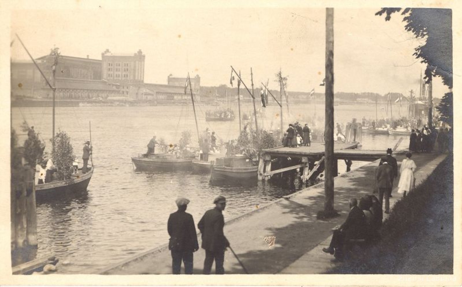 Svētki Ventspils zvejnieku ostā Ventas kreisajā krastā. Labajā krastā redzamas tirdzniecības ostas celtnes- graudu elevators un saldētava