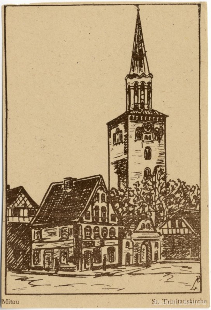 Jelgavas Svētās Trīsvienības luterāņu baznīcu sāka celt 1574.gadā un pabeidza 1625.gadā. Vācu evanģēliski luteriskās Svētās Trīsvienības baznīcas tornis ir celts no 1660. līdz 1688.gadam. Astoņstūraino zvanu torni baznīca ieguva 1862.gadā. Baznīca pati gāja bojā Otrā pasaules kara laikā, līdz mūdienām ir saglabājusies torņa senākā daļa (pārklāta ar piramīdas veida stikla jumtu) un baznīcas vārti