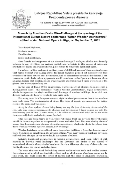 Speech by President Vaira Vike-Freiberga at the opening of the international Europa Nostra conference "Urban Wooden Architecture" at the Latvian National Opera in Riga, on September 7, 2001