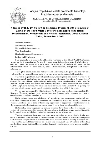 Address by H. E. Dr. Vaira Vike-Freiberga, President of the Republic of Latvia, at the Third World Conference against Racism, Racial Discrimination, Xenophobia and Related Intolerance, Durban, South Africa, September 1, 2001