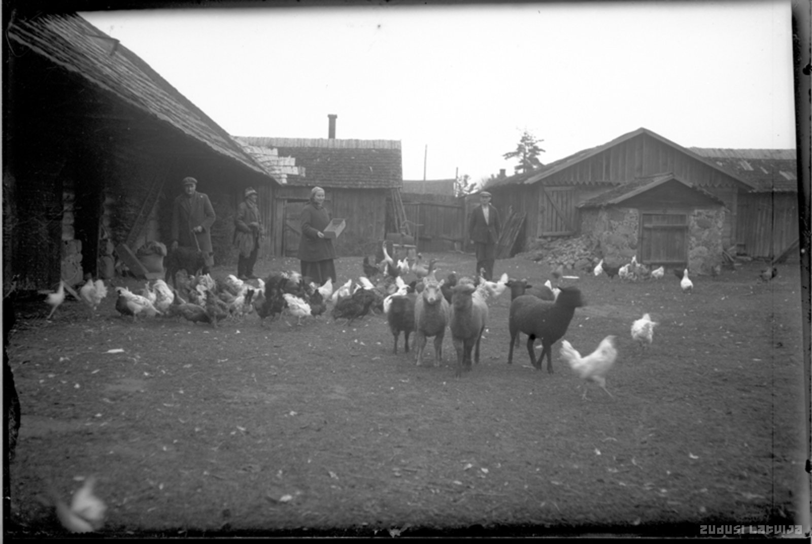 Cilvēki lauku mājas pagalmā ar vistām un aitām