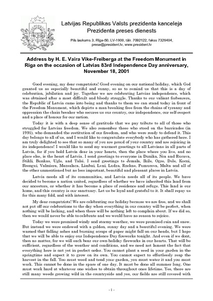 Address by H. E. Vaira Vike-Freiberga at the Freedom Monument in Riga on the occasion of Latvias 83rd Independence Day anniversary, November 18, 2001
