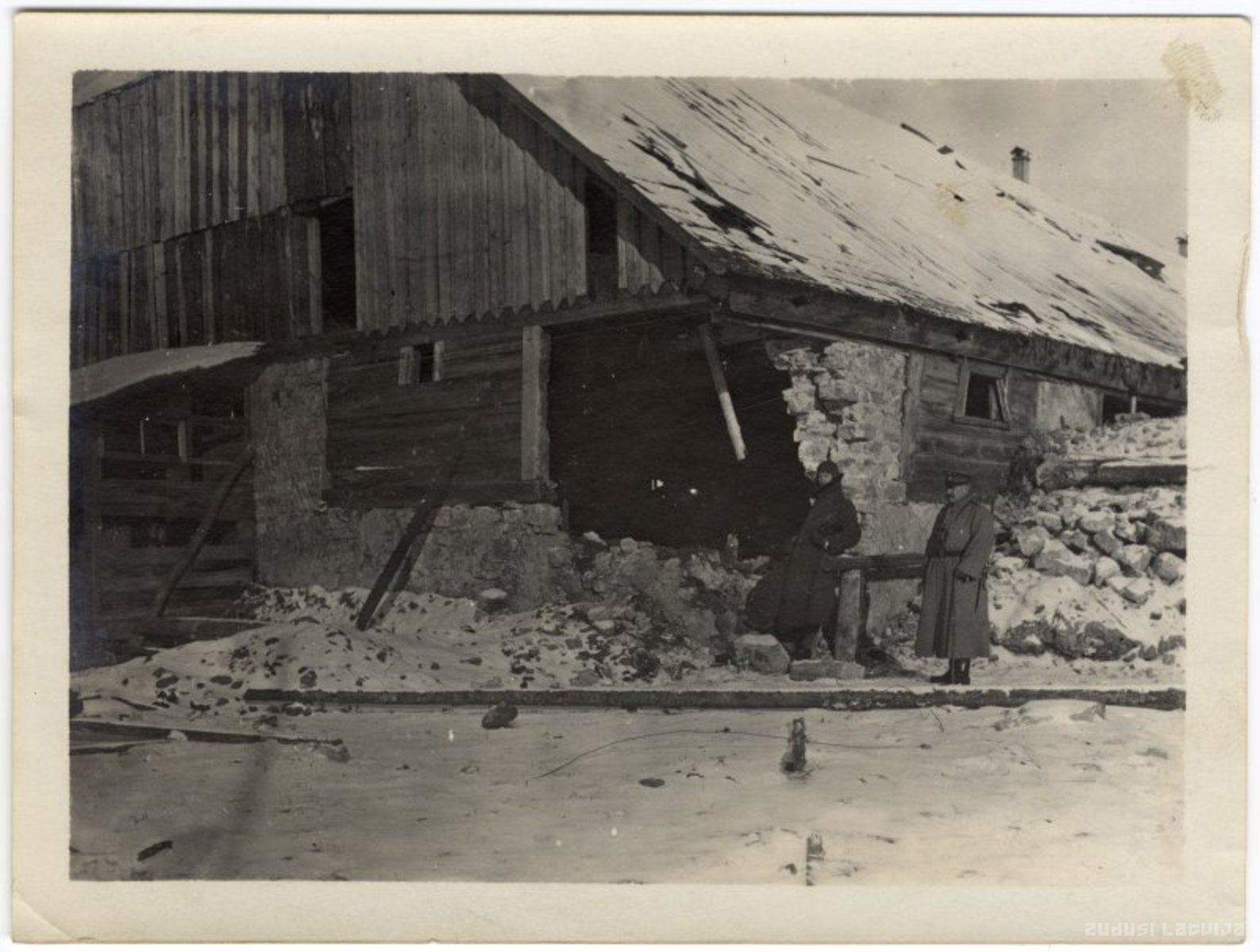 Krievu armijas virsnieks ar kareivi pie kādas izpostītas ēkas Pirmā pasaules kara laikā