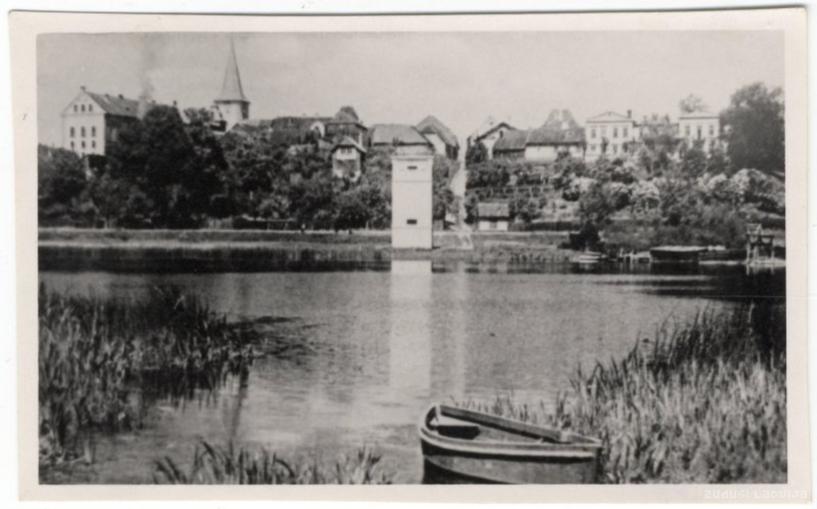 Skats uz Tukumu no Tukuma jeb Dzirnavu ezera. Ezers nosusināts padomju varas laikā 1947. gadā. Pirmoreiz Tukuma vārds rakstiskos vēstures avotos minēts 1445. gadā (Hakelwerk). Iesākumā tas bijis īsts vācu tirgotāju un amatnieku miestiņš. 1795. gadā Tukumam piešķīra apriņķa pilsētas tiesības. Tālumā redzams 1644. gadā celtās Tukuma Sv.Trīsvienības evaņģēliski luteriskā baznīcas tornis
