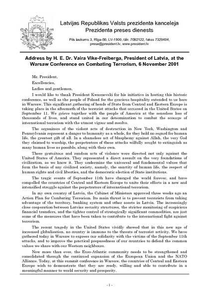 Address by H. E. Dr. Vaira Vike-Freiberga, President of Latvia, at the Warsaw Conference on Combating Terrorism, 6 November 2001