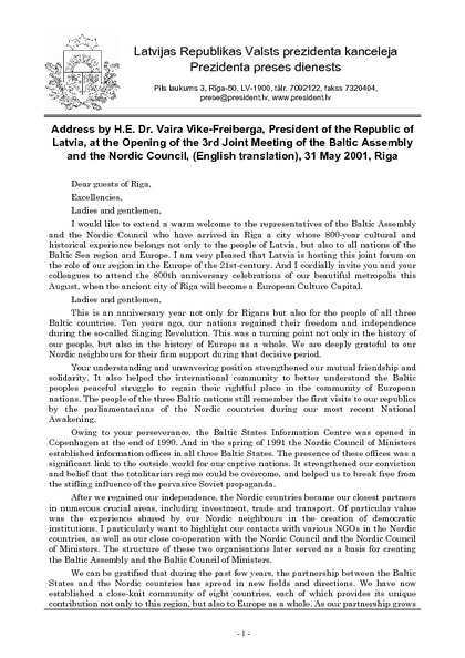 Address by H.E. Dr. Vaira Vike-Freiberga, President of the Republic of Latvia, at the Opening of the 3rd Joint Meeting of the Baltic Assembly and the Nordic Council, (English translation), 31 May 2001, Riga