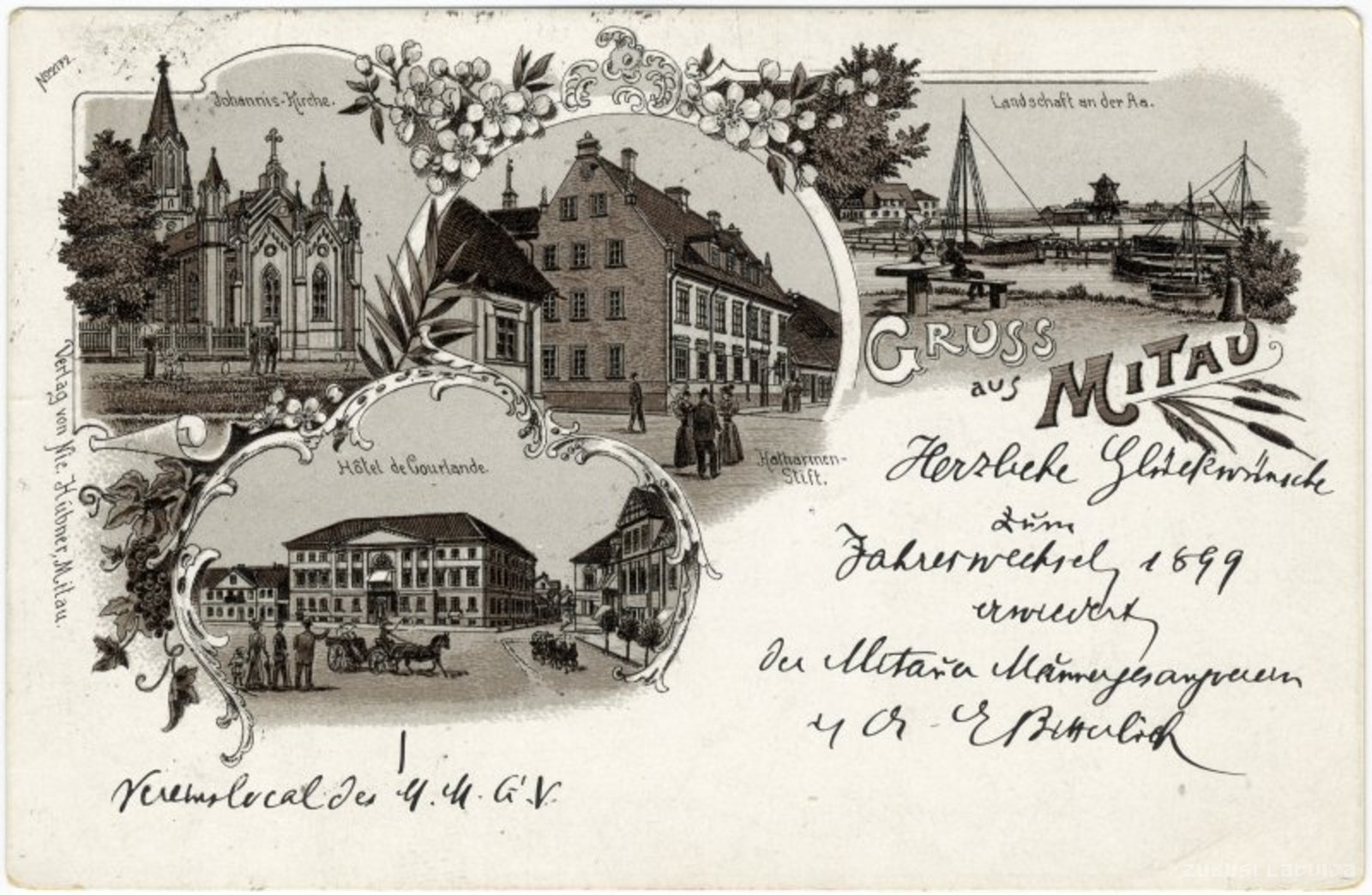 Jelgavas skati ar Sv. Jāņa baznīcu, Katrīnas patversmi, Kurzemes viesnīcu un Sniķes krogu