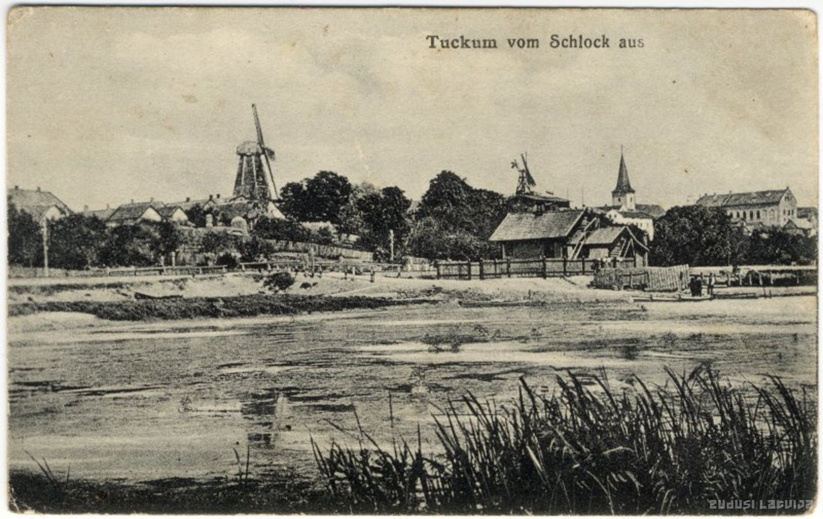 Skats uz Tukumu no Tukuma jeb Dzirnavu ezera. Ezers nosusināts padomju varas laikā 1947. gadā. Pirmoreiz Tukuma vārds rakstiskos vēstures avotos minēts 1445. gadā (Hakelwerk). Iesākumā tas bijis īsts vācu tirgotāju un amatnieku miestiņš. 1795. gadā Tukumam piešķīra apriņķa pilsētas tiesības. Tālumā redzams 1644. gadā celtās Tukuma Sv.Trīsvienības evaņģēliski luteriskā baznīcas tornis