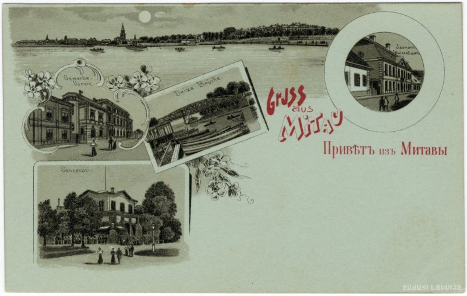 Jelgavas skati ar Amatnieku biedrības namu, Driksas tiltu, Reālskolas namu, Pilsdārza paviljonu