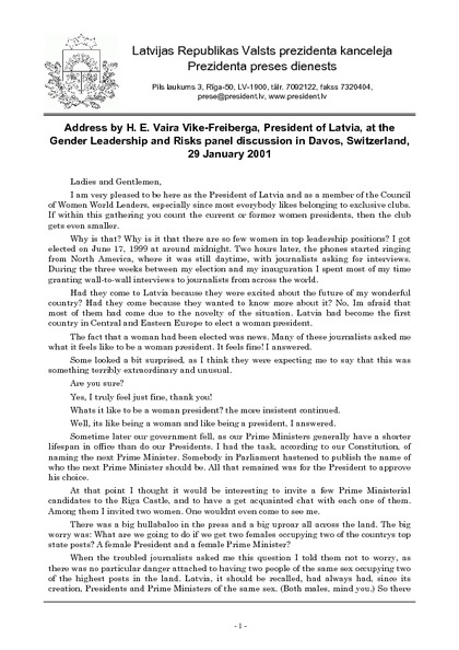 Address by H. E. Vaira Vike-Freiberga, President of Latvia, at the Gender Leadership and Risks panel discussion in Davos, Switzerland, 29 January 2001