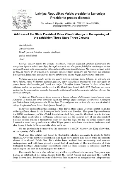Address of the State President Vaira Vike-Freiberga in the opening of the exhibition Three Stars Three Crowns
