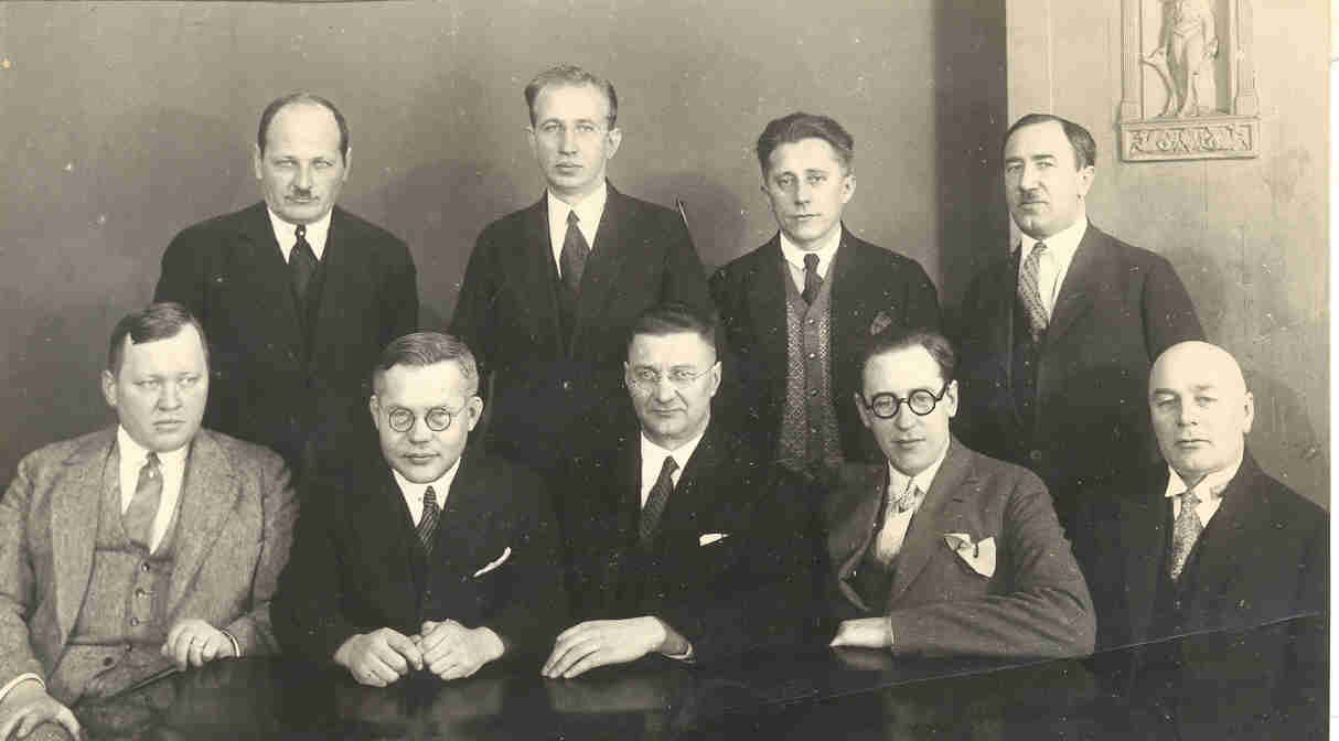 Literātu grupa. Redzami: A. Erss, A.Zalts, P.Rozītis, Porietis, A.Bīlmanis, J.Kārkliņš, R.Egle, Literāts