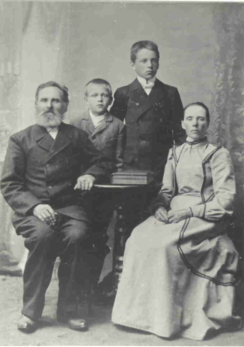 Redzami: Pēteris Lapiņš (1890-1971), viņa brālis Jānis un vecāki Anna un Jānis Lapiņi. Ģimene fotografēta 1907.g. vasarā iesvētīšanas dienā.