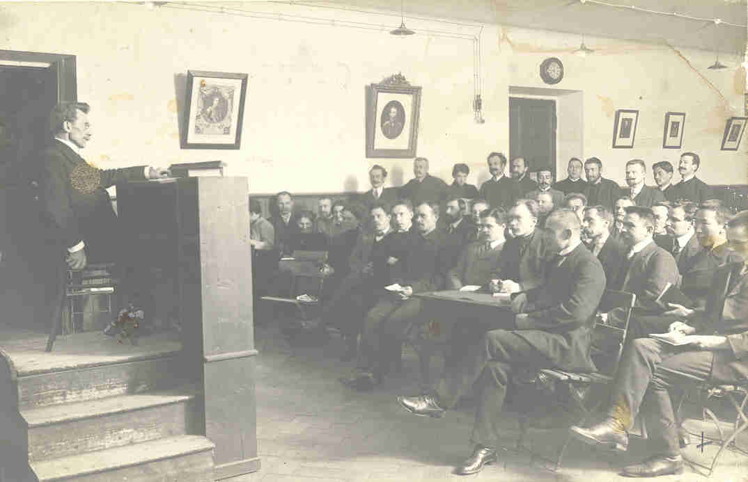 P. Lapiņš (pirmais 1.rindā no labās puses) Maskavas A. L. Šaņavska universitātes profesora Ševšeņovica lekcijas klausītāju vidū.