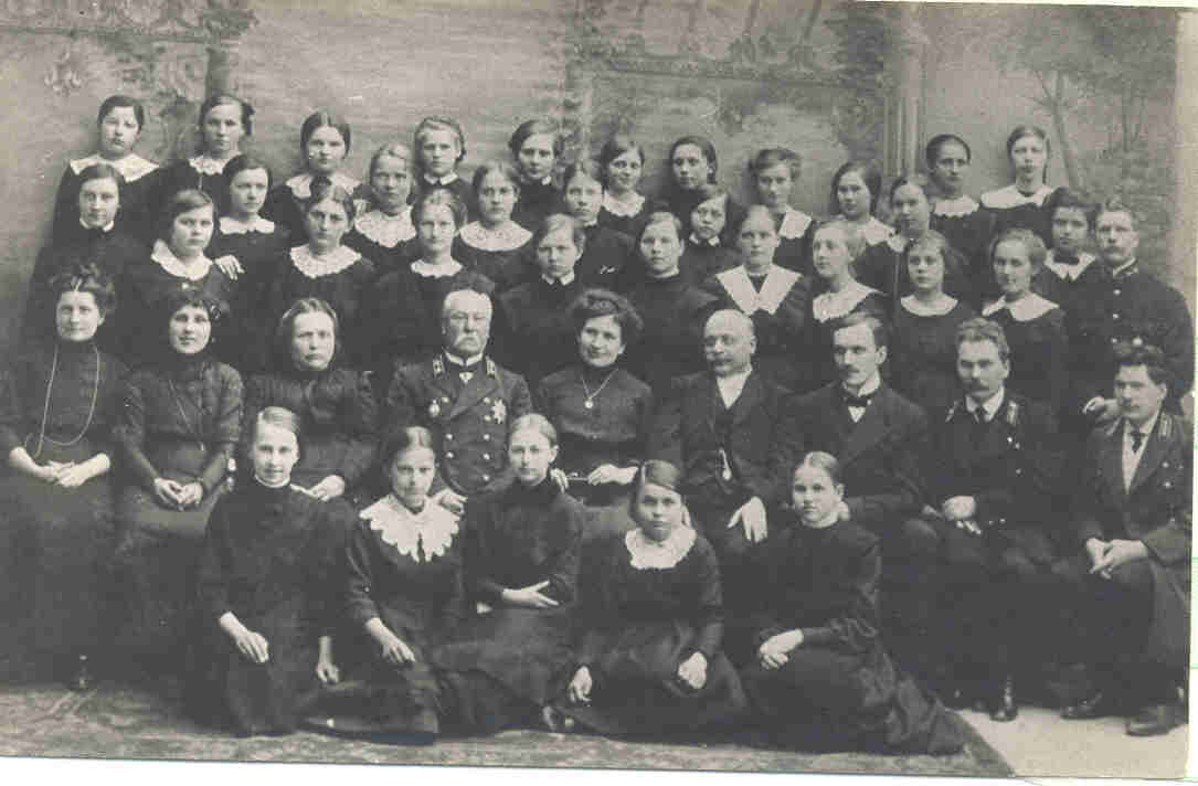 Sēž no labās puses pirmais komponists Jēkabs Mediņš, trešais-mācītājs Kārlis Kundziņš (1883-1967), ceturtais-mācītājs Ed.Pavasars,vidū-direktore Marta Daugule. Viņai blakus skolas inspektors, tad "klases dāma" Poroikova, pirmā no kreis